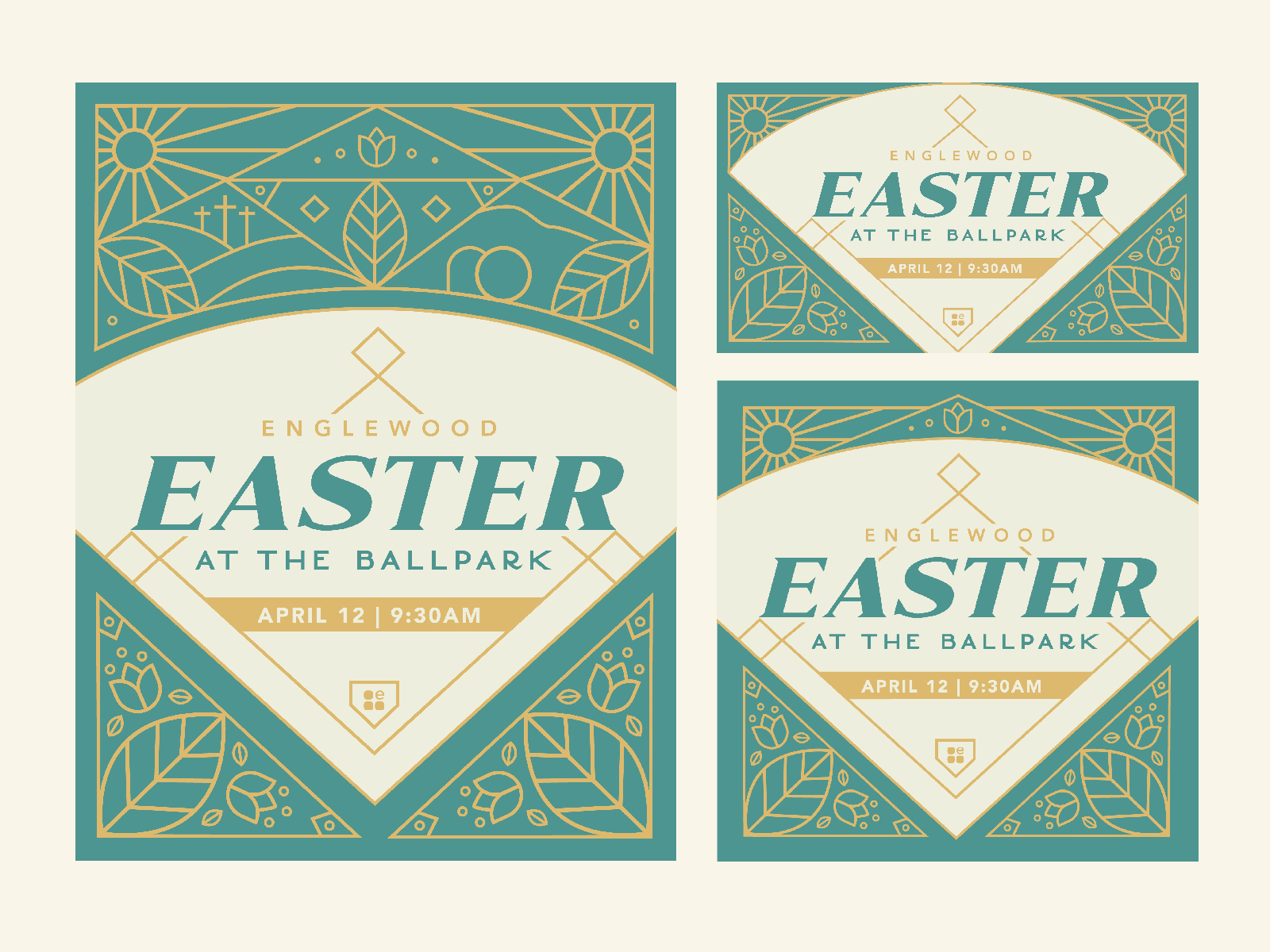 Englewood Baptist Church hosts Easter services at the Jackson Generals stadium, which inspired the combination of a baseball diamond with the more traditional spring line illustrations to create this design. Due to the onset of the pandemic, this event was cancelled and adjustments were made to the design to accomodate online services.